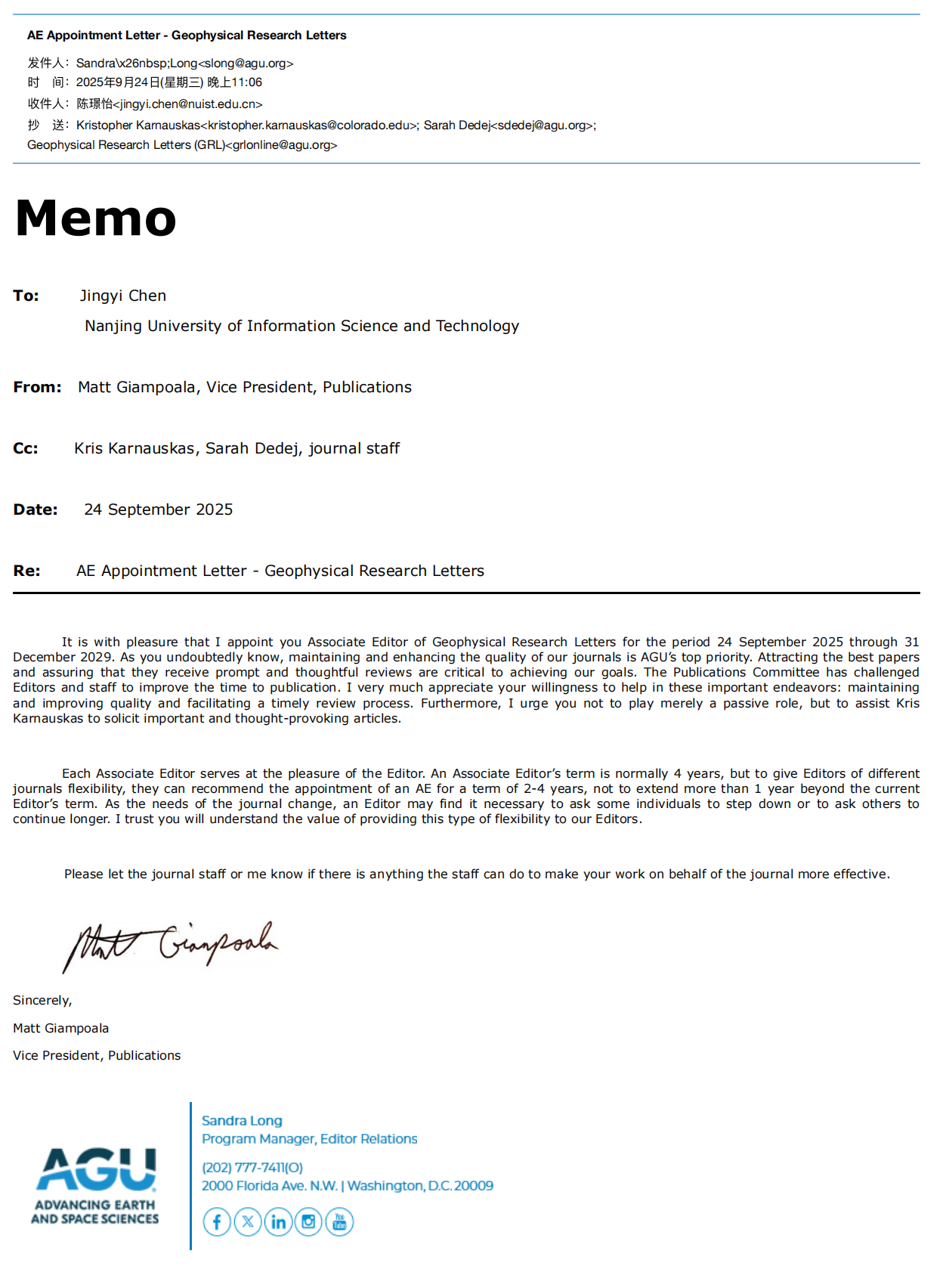 近日,国际知名学术期刊《Geophysical Research Letters》(GRL)发函邀请陈璟怡教授担任其编委会副编辑(Associate Editor),任期自2025年9月24日开始。