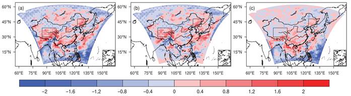 图1.控制试验与敏感性试验对夏季降水模拟结果的差异 (单位:mm):(a)全边界试验;(b)北边界试验;(c)南边界试验。打点区域表示差别通过95%显著性检验。黑色框线选中区域为夏季降水异常增多的区域(