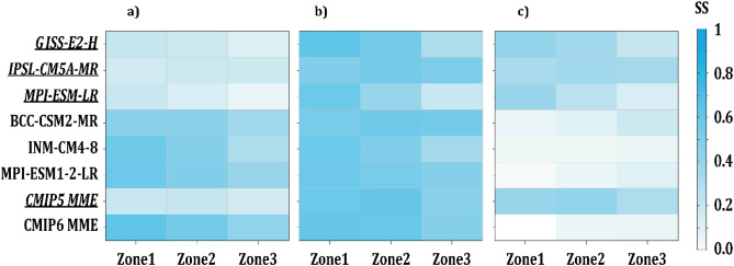 图1 CMIP5(粗斜体下划线)和CMIP6模式中a)订正前的GCMs;b)订正后的GCMs的技巧评分(SS); c)订正前后GCMs技巧评分的差值。