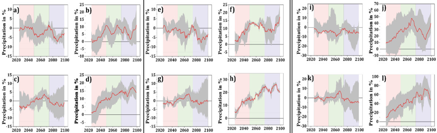图2 模式预估的苏丹北部(左)、苏丹中部(中)和苏丹南部(右)2025-2099年季风降水的面积平均变化(%)。上下行分别代表CMIP5和CMIP6模式预估结果,左列和右列分别代表中等和高等排放情景下的预估。红线代表多模式集合。灰色阴影表示预测的66%可能范围。红色、绿色和蓝色背景分别表示近期、中期和远期。