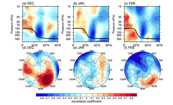 图1 (a-c)AO指数与30–400 hPa纬向平均臭氧浓度的相关系数分布;(a)12月,(b)1月和(c)2月。(d-f)与(a-c)类似,为AO指数与70–100 hPa平均臭氧浓度的相关系数分布。黑色实线为每个月纬向平均的对流层顶。打点区域为能通过90%显著性检验的区域。