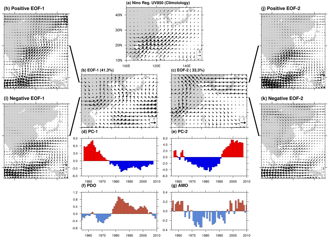 虽然许多研究已经发现ENSO与东亚冬季风的关系(EER)在年代际上是不稳定的,但于对EER具体变化特征及其调控因子却存在很大争议,尤其是AMO或PDO的作用。施健博士在前人工作的基础上,区分了EER年代际变化的主要模态,并阐述了AMO和PDO对不同模态的影响。