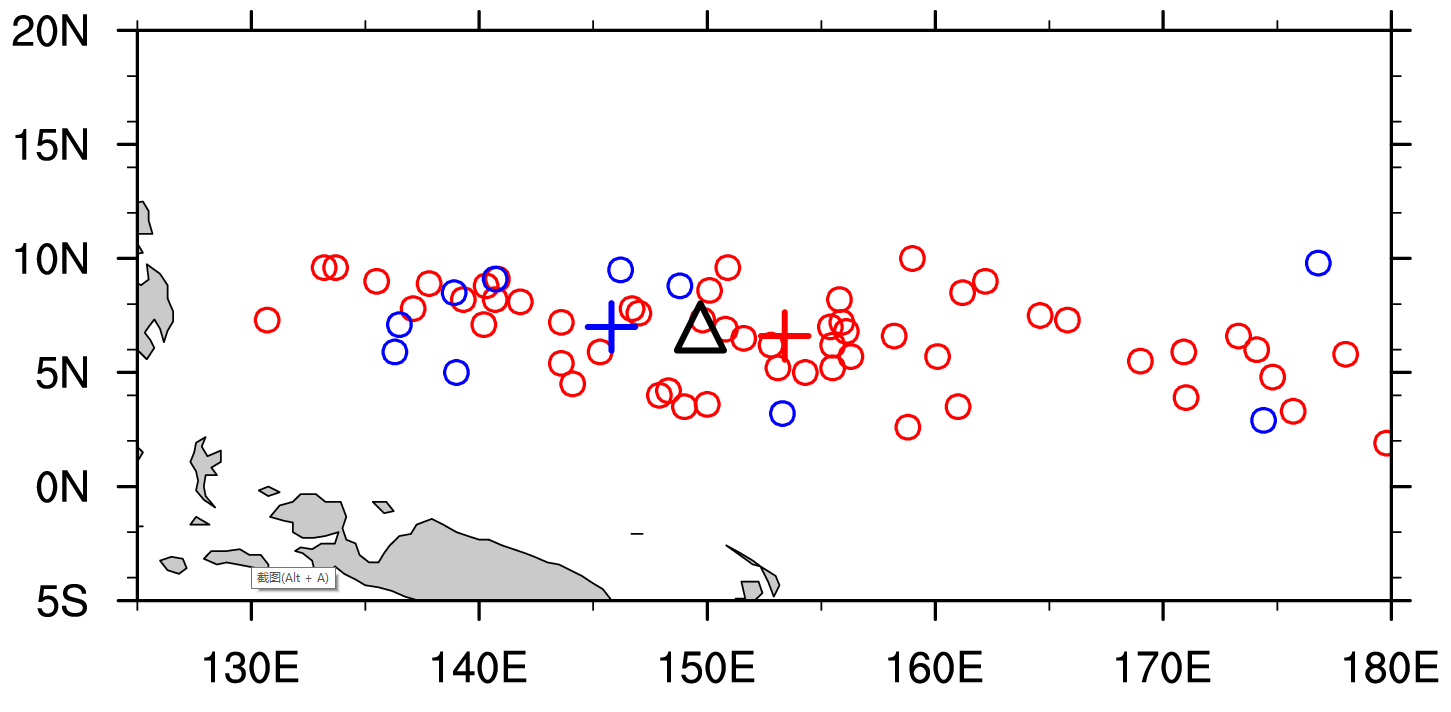 Figure 1 The composite low-latitude (within 10 °N) TCG positions during January to September for ST (red circles) and RT El Niño events (blue circles). The black triangle indicates the mean TCG position. The red (blue) cross indicates the mean TCG position for ST (RT) group