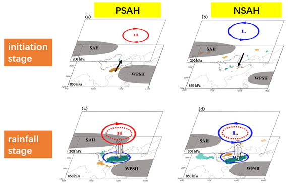 近期,王璐教授和硕士生程一峰通过对观测资料进行客观分类揭示出长江中下游夏季10-30天持续性强降水的发生过程对应两种不同的高低层环流配置变化:一类事件对应高层南亚高压的东扩以及低层西太副高西伸,约占总事件的35%(称为PSAH事件),另一类事件对应高层南亚高压西退和西太副高西伸,约占总数的15%(称为NSAH事件)。这两类降水事件都对应梅雨锋面系统,但锋面的形成机制并不一样(图1)。对于PSAH事件,在降水发生前西北太平洋异常反气旋较强,对应的西南风异常通过引起湿平流向长江中下游地区输送水汽,引起当地大气不稳定并触发降水;高层南亚高压东伸对降水发生并没有贡献。对于NSAH事件,降水发生前西北太平洋异常反气旋局限在海洋上,长江中下游受北风异常的影响,北风异常携带干冷空气南下,有利于触发锋面降水。而南传的北风异常可能部分受南移的中高纬度环流异常的影响。本研究揭示了季节内降水异常发生机制的多样性。该研究成果已在《Journal of Climate》上正式刊出。