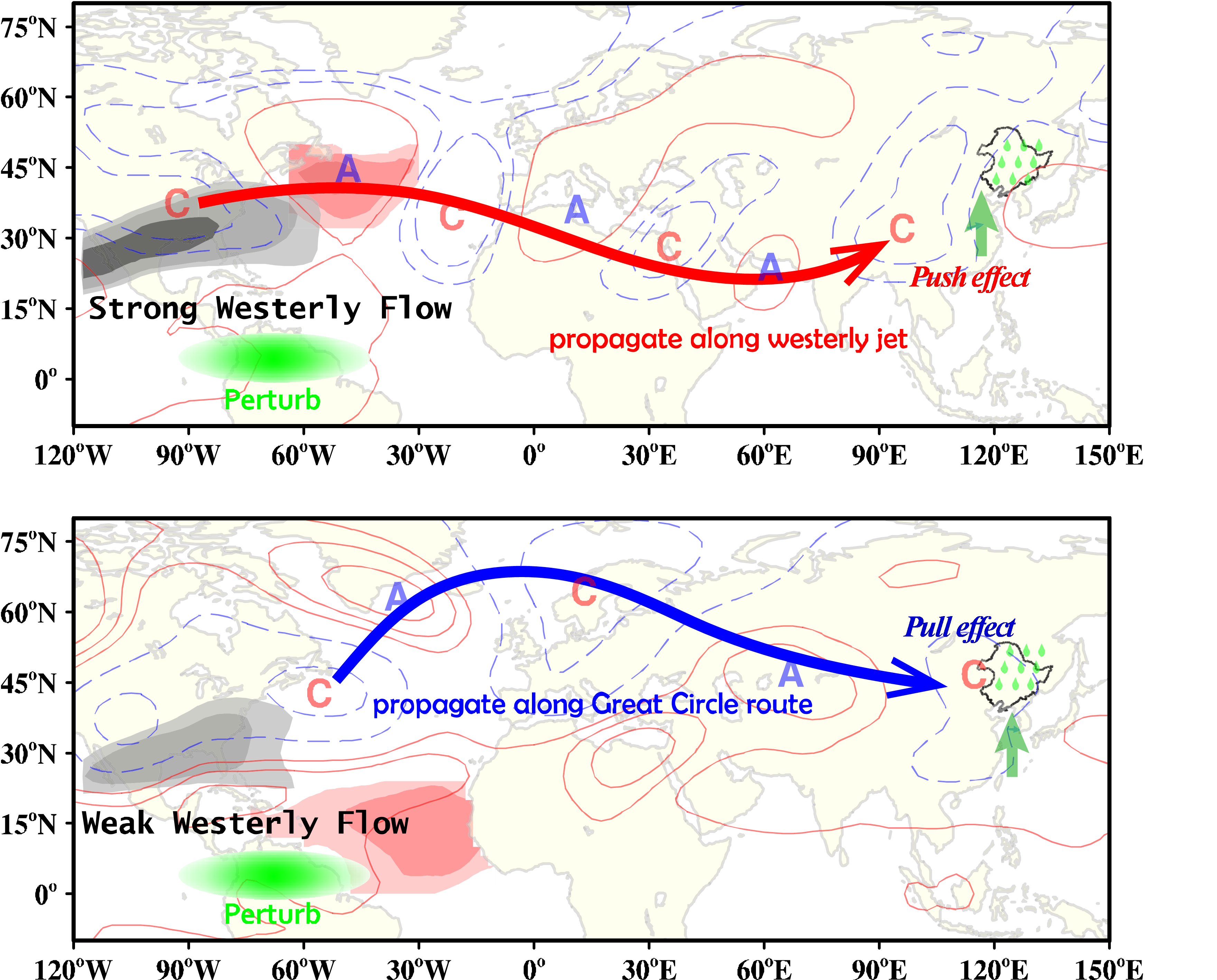 朱志伟教授课题组通过观测诊断和数值模拟的手段揭示了影响东北春季降水的大气遥相关型“推拉作用”在近60年内(1961-2020)发生的年代际交替转换现象:在20世纪80年代中期前,热带大西洋西侧降水扰动在较强北美/大西洋西风急流作用下,产生与热带外北大西洋海表温度耦合的、沿西风急流传播的准定常罗斯贝波,导致东亚地区受到气旋性环流的控制,气旋性环流中心位于青藏高原附近,其东侧偏南风发挥“推”的作用,将水汽推送至东北,导致降水增多;在20世纪80年代中期后,由于北美/大西洋西风急流强度大大减弱,与热带大西洋暖海温耦合的大西洋西侧降水扰动可直接激发沿“大圆路径”传播的罗斯贝波列,导致东亚地区受到气旋性环流的控制,气旋性环流中心位于蒙古地区,其东侧偏南风发挥“拉”的作用,将水汽拉至东北,导致降水增多(如图所示)。
