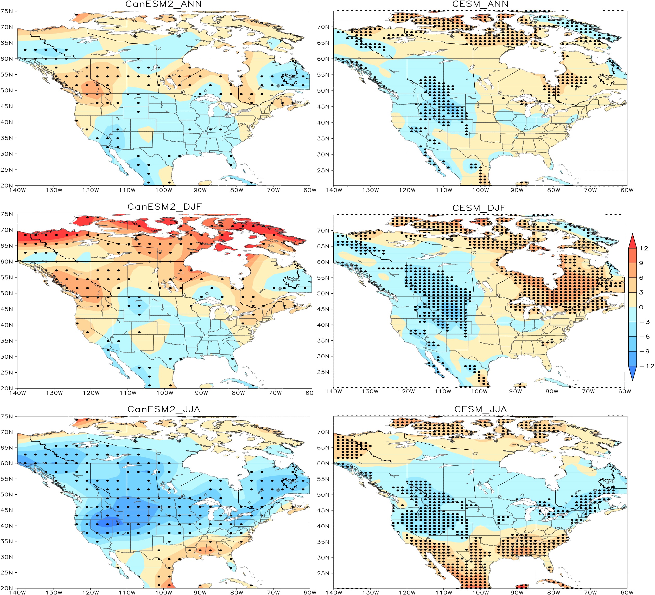 图1. 基于CanESM2-LE和CESM-LE的本世纪末期,全年,夏季以及冬季极端风速相对于当前的变化。黑色实心点代表受外强迫影响大的地区(信噪比大于1)