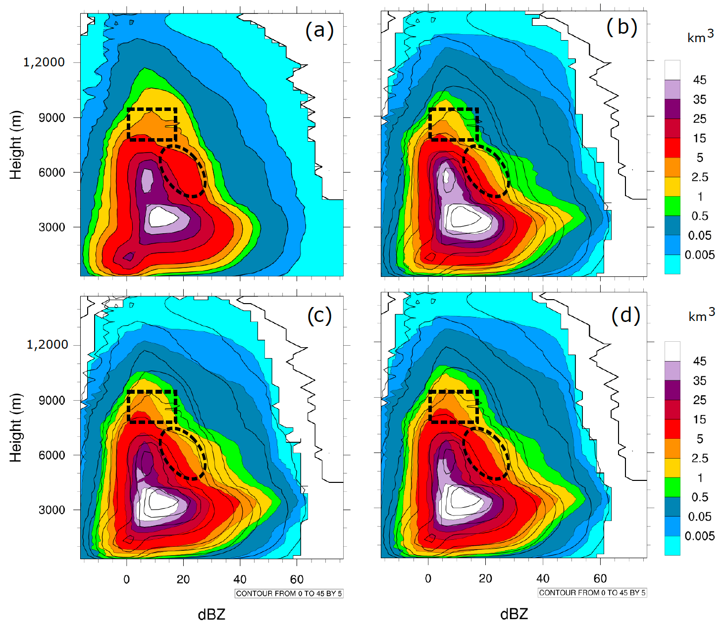 图1. 基于2020年6月1日-7月1日德国国家气象局雷达网络的反射率CFADS: (a) 观测 (b) 没有使用LHN (c) 使用LHN1 (d) 使用LHN2。 (b-d) 中的实线为观测的等值线。