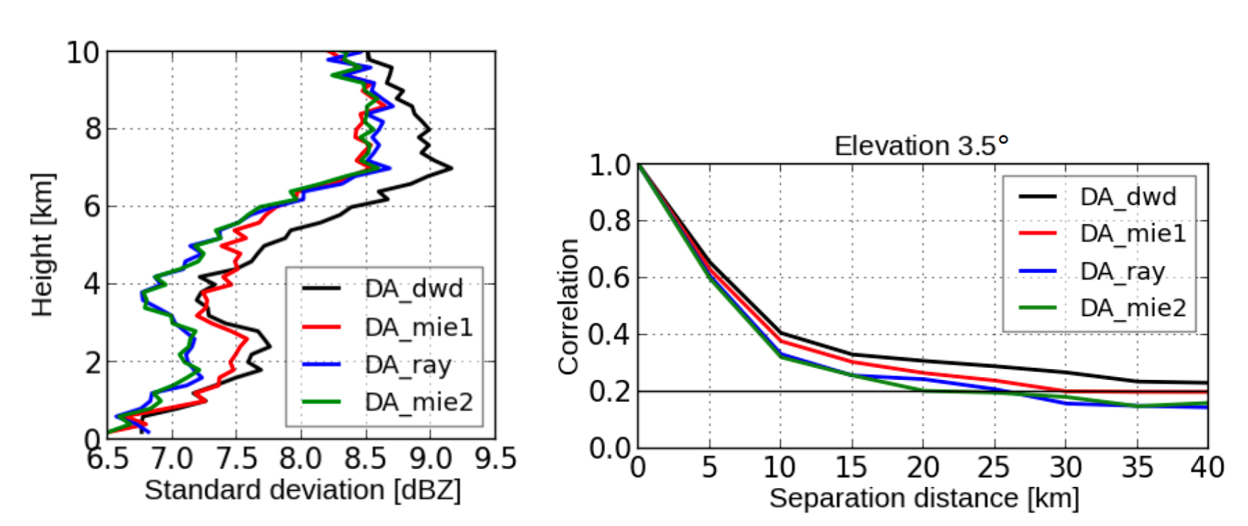 图2. 仰角3.5o 反射率观测误差的标准差的垂直廓线(左图)和水平相关性的长度(右图), 其中DA_mie1和DA_mie2分别为使用旧的和新的融化层参数。
