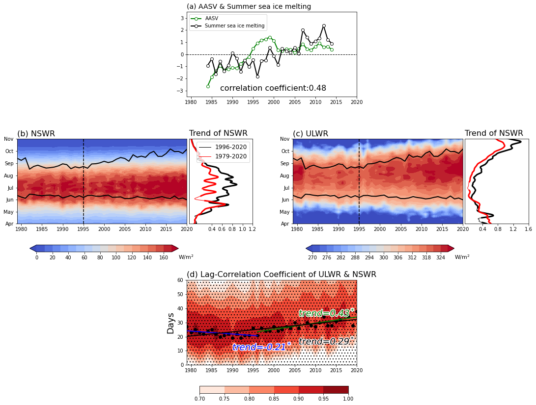 Figure 1. (a) The AASV and summer Sea ice melting. (b) The daily net shortwave radiation flux (negative upward) and its trend, red for 1979–2020). (c) is the same as (b) but for daily upward radiation flux (positive upward). (d) Distribution of lag-correlation coefficient between ULWR and NSWR.