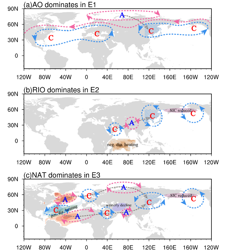 朱志伟教授课题组的最新研究指出,近60年存在三个影响东北亚地表气温的因子,这三个因子在不同年代交替主导东北亚地表气温。E1(1961-1994)阶段,北极涛动(AO)起主导作用;E2(1995-2004)阶段,热带印度洋降水(RIO)起主导作用;E3(2005-2020)阶段,北大西洋三极子海温(NAT)起主导作用。在E1阶段,AO负位相相关的中纬度负位势高度异常导致东北亚地表气温负异常,而在E2和E3阶段,鄂霍茨克海至白令海的海冰减少减弱,切断了AO和东北亚春季地表气温之间的联系,导致AO在E2和E3阶段减弱,对东北亚地表气温影响减小。在E2阶段,印度洋负降水异常导致的非绝热加负异常激发了阿拉伯海至东北亚的正压Rossby波列,导致东北亚气旋异常和地表气温负异常;在E3阶段,与北大西洋的三极型海温异常相关的两条准定常Rossby波列从北大西洋传播至东北亚,导致了东北亚气旋异常和地表气温负异常。从E2到E3阶段,中亚地区西风急流显著减弱,北大西洋三极型海温异常相关降水异常显著增加,共同导致了主导因子从RIO到NAT的转变(如示意图所示)。