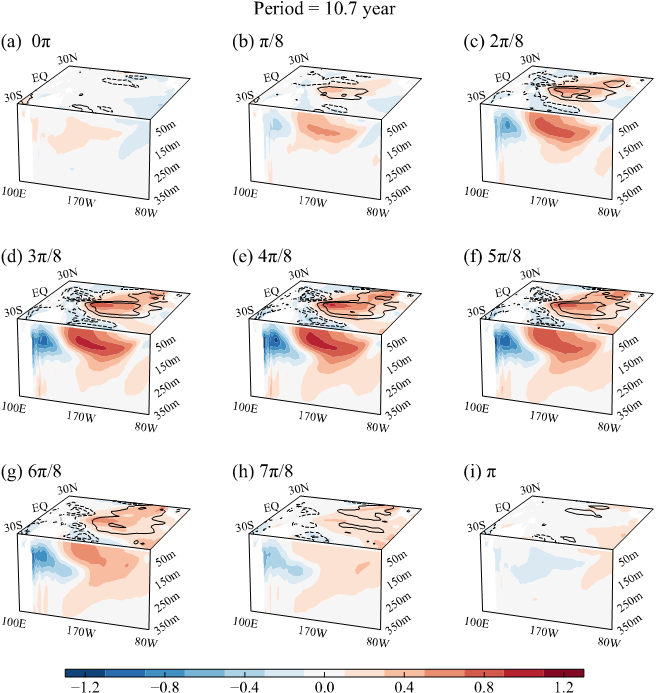 图1 热带太平洋准十年变率的典型位相演变特征,填色为海表及赤道次表层垂直剖面的温度异常,等值线为海表高度异常