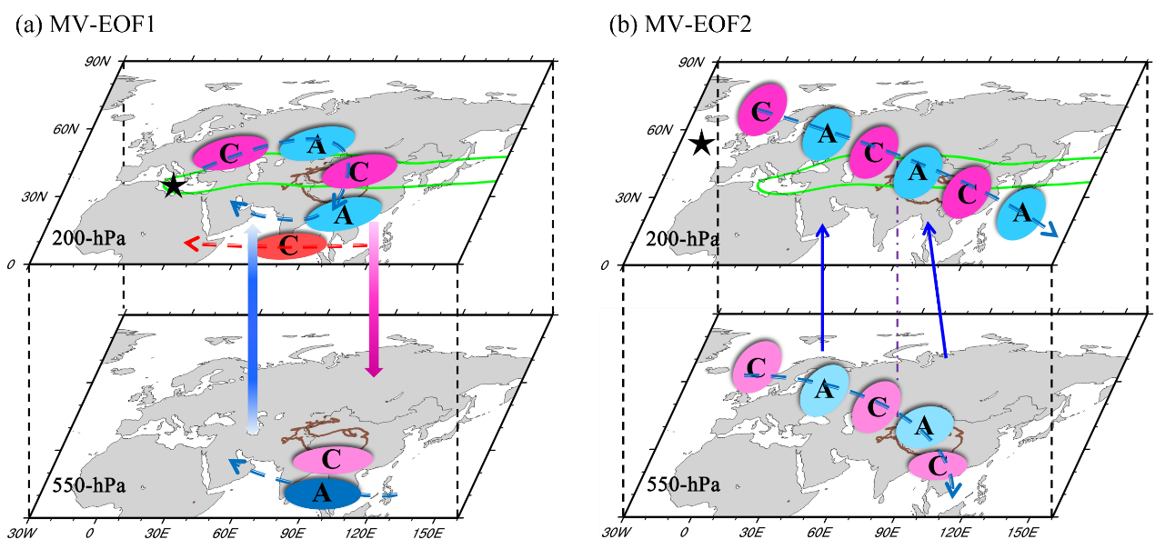 图1 对流层上层(顶部)和青藏高原近地表(550hPa,底部)高原夏季风的(a)MV-EOF1和(b)MV-EOF2的结构和演变示意图。字母A和C表示反气旋(蓝色椭圆)和气旋(粉色椭圆)涡度中心。虚线箭头表示波列的传播路径。绿色等值线表示西风急流的位置(20ms-1等值线)。棕色等值线表示海拔大于3000m的青藏高原地区。黑色星号代表波列的波源。(a)中的垂直箭头表示高层和低层的耦合效应和中纬度和热带之间的相互作用,(b)中的蓝色垂直箭头分别表示准正压结构和微斜压结构。