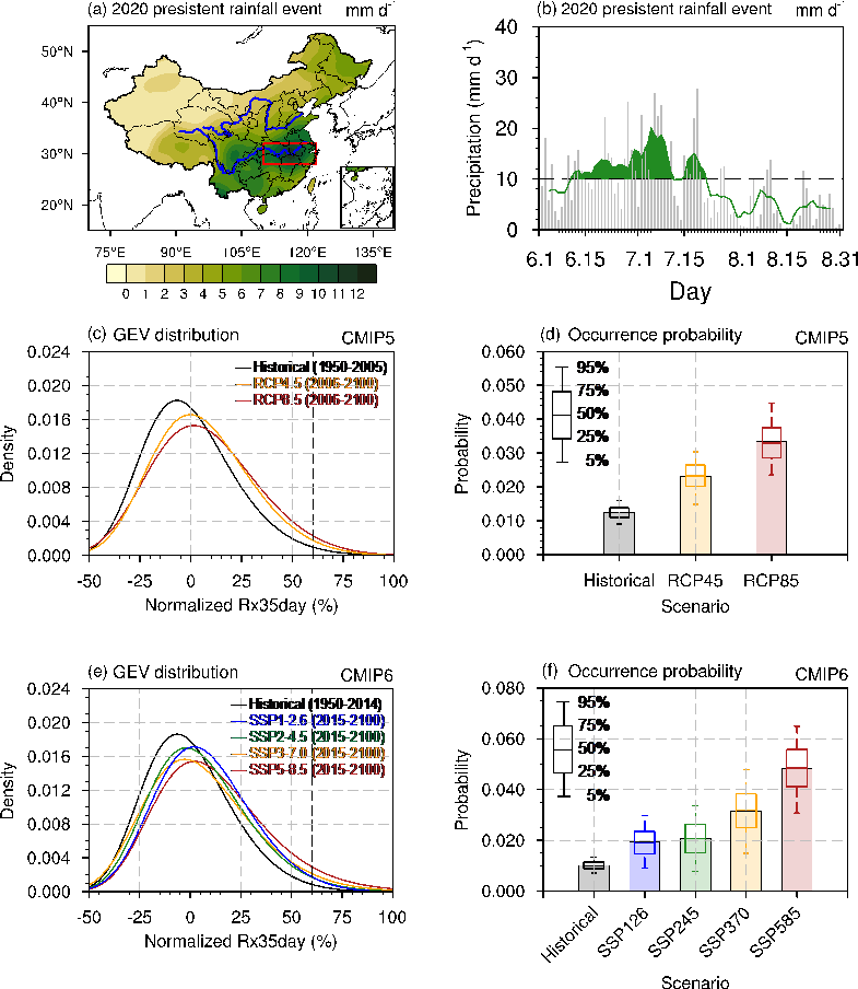 图1:(a)2020年夏季平均降水异常空间分布,红框为长江中下游地区;(b)2020年夏季长江中下游地区逐日降水;(c)7个“可靠”的CMIP5模式模拟的在不同排放情景下的标准化Rx35day的GEV拟合分布以及(d)类2020年持续性极端降水事件发生概率的未来预估及其不确定性;(e)、(f)为基于7个“可靠”的CMIP6模式的未来预估结果。