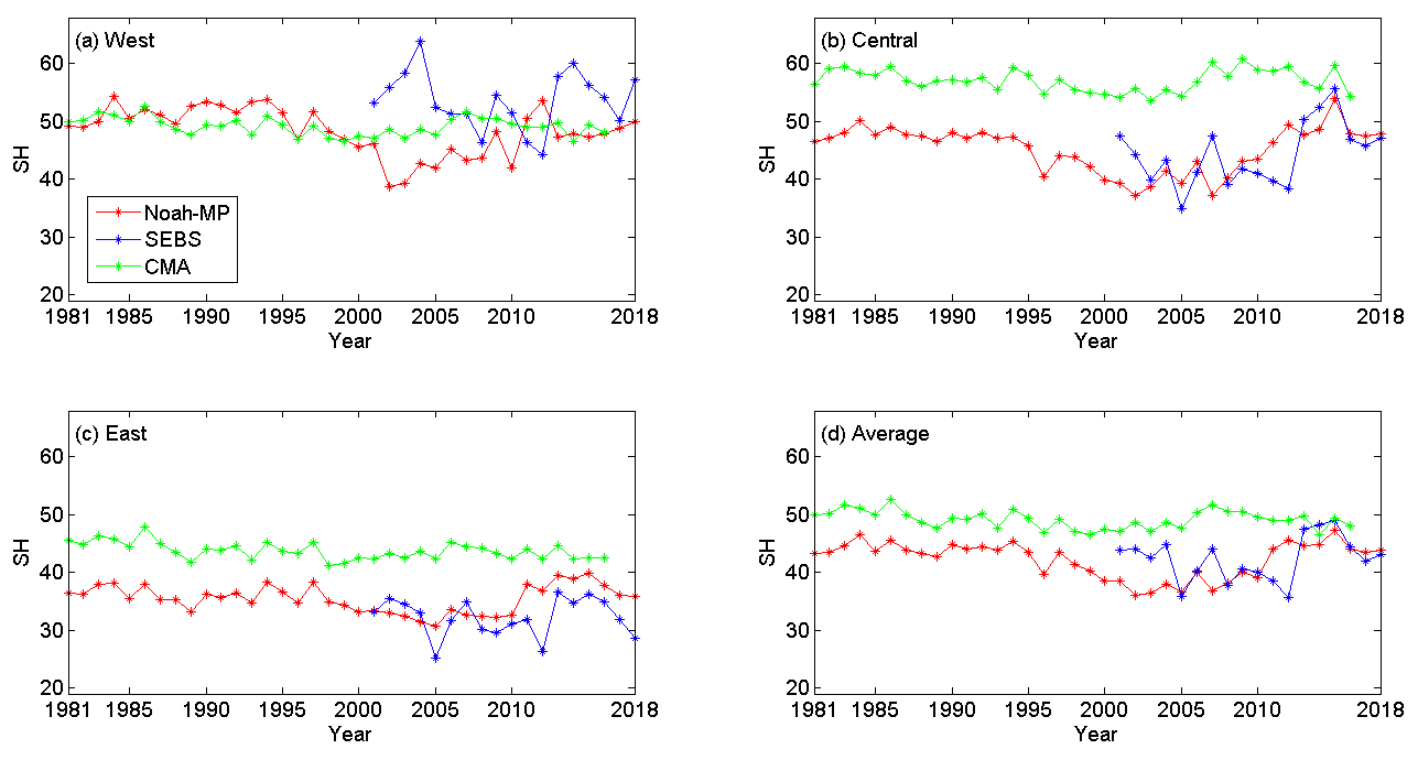 图2 基于Noah-MP、SEBS和CMA气象站的青藏高原西部、中部、东部和整体的1981-2018年平均地表感热通量(单位:W m-2)变化