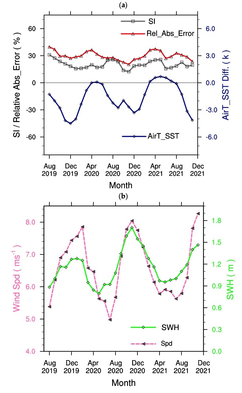 图2 CFOSAT SWH的RAE和SI与原位观测(a)的方差,其中RAE(红线)。利用23个浮标的RAEs计算月平均值。气—海温差(蓝线)与RAE有显著相关性。浮标((b),绿线)的SWH与月平均RAE之间的时间相关系数为—0.73(达到95%置信水平)。SI指数((a),灰线)和浮标风速((b),粉红线)是逐月23个浮标的月平均值。