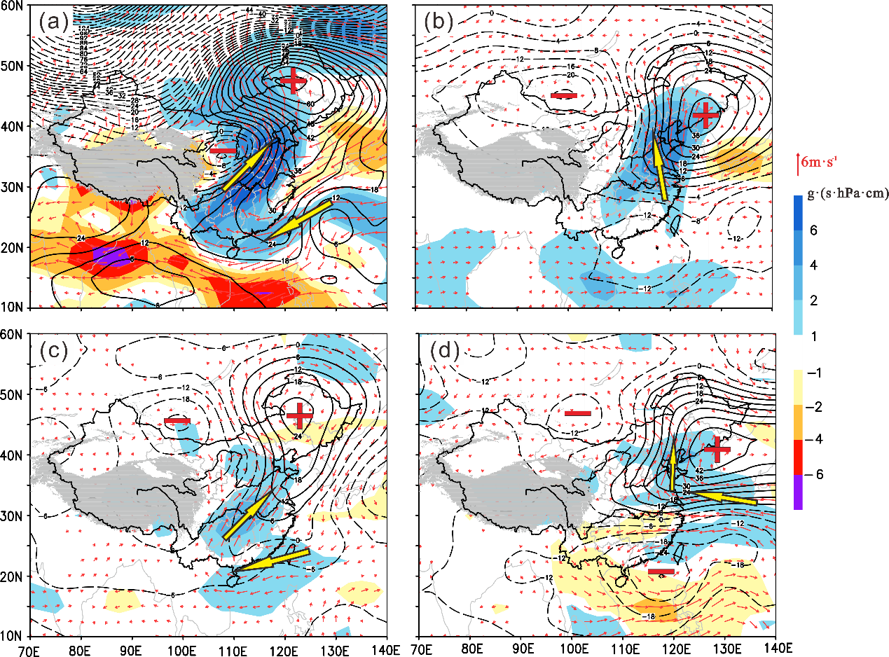 图2 (a)2021年、(b)历史事件、(c)主雨带在38°N以南的历史事件和(d)主雨带在38°N以北的历史事件RPEPEs的平均环流异常分布;黑色等值线是500hPa位势高度异常(dagpm),红色箭头是850hPa水平风异常(≥1m·s-1),填色是850hPa水汽通量异常(g·s-1·hPa-1·cm-1),大的黄色箭头示意水汽通道位置。
