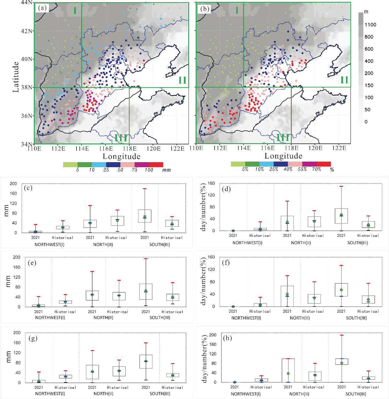 图1 华北地区2021年RPEPEs(a)平均累计降水量(mm)和(b)暴雨日频率(%)的水平分布;阴影填色为地形高度(m)。2021年和历史个例的RPEPEs在三个子区域上的(c)降水量(mm)和(d)暴雨日频率(%)统计。其中(e)和(f)与(c)和(d)相同,表示经向型的统计结果;(g)和(h)是纬向型的统计结果。红色短线表示最大值,黑色短线表示最小值,绿色实心圆表示平均值,蓝色短线表示中位数,两条黑色长实线分别表示两个四分位数。
