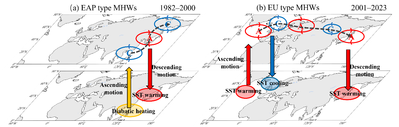 图2 日本海夏季海洋热浪发生发展的大气环流动力机制示意图:(a)1982—2000年EAP波列影响海洋热浪机理;(b)2001—2023年EU波列影响海洋热浪机理。