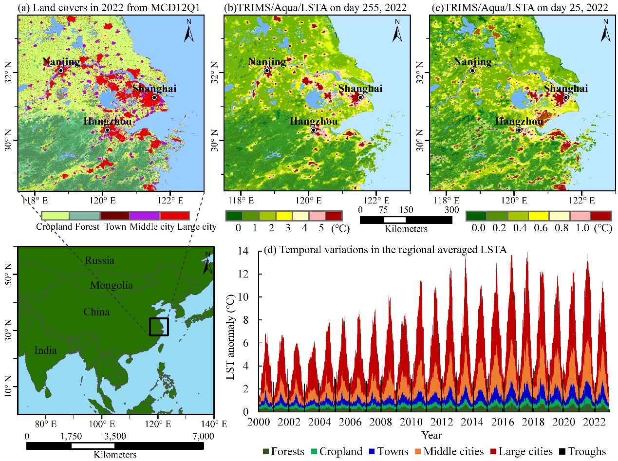Figure 1. Spatial distribution of the five dominant land use types from the MCD12Q1 data in 2022 (a); the TRIMS Aqua LSTA on days 255 and 25, 2022 (b,c); and the LSTA annual cycles of forests, cropland, towns, and middle and large cities in 2000–2022 (d).