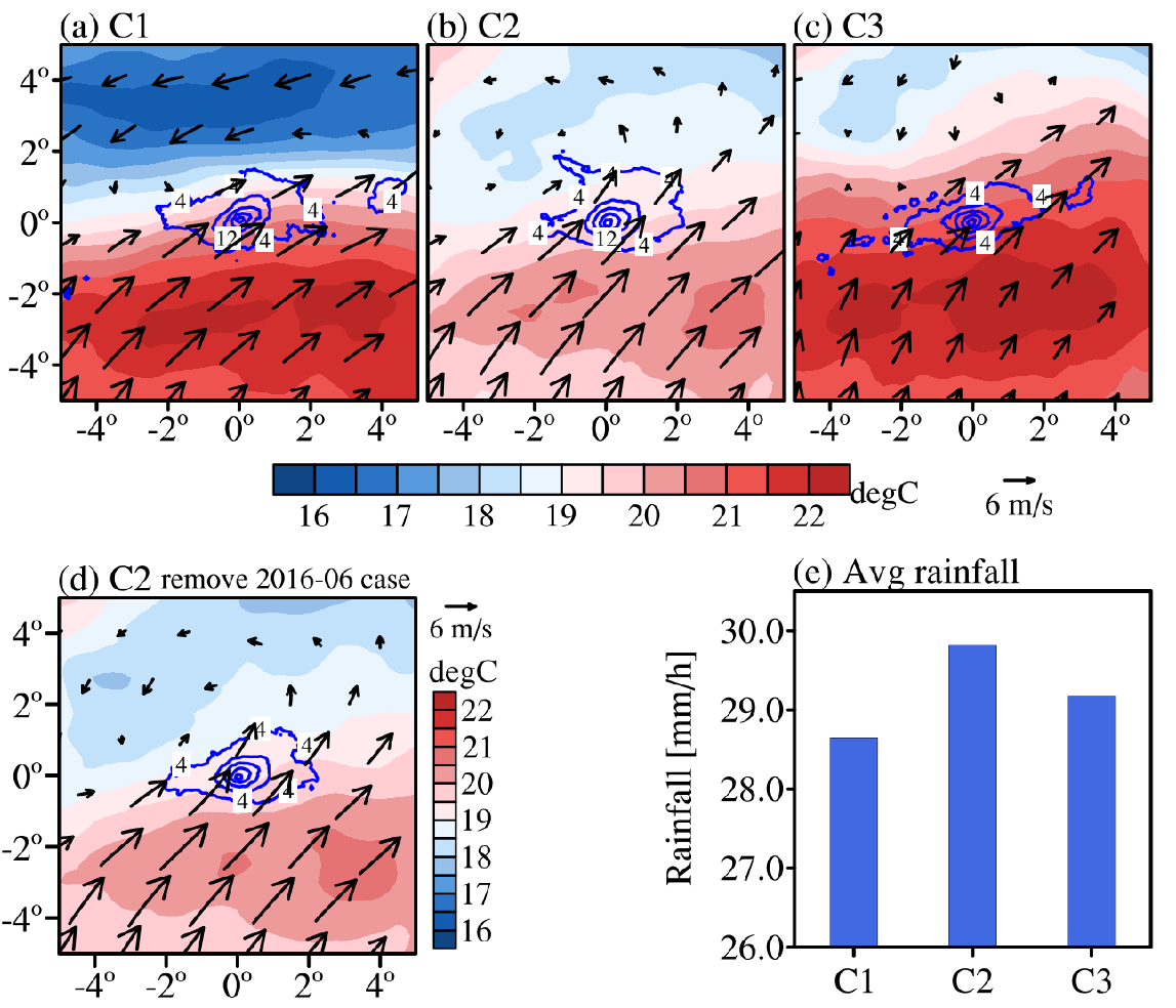 该项研究采用坐标系跟随降雨中心的方法,重构了EHR发生时降雨中心伴随的动力和热力场(图1),之后通过客观分型将筛选出来的EHR分为三类,在分类的基础上对三类降雨形成机制进行探究。