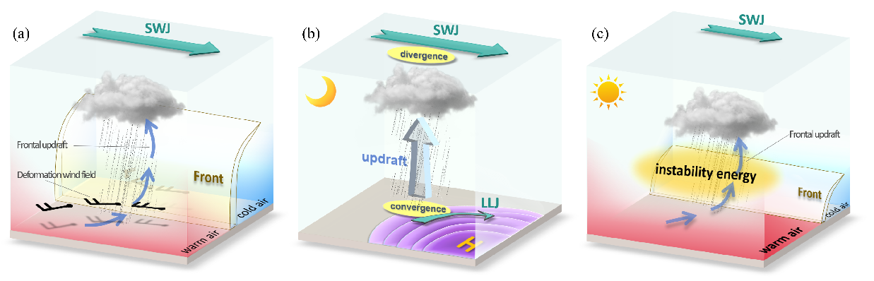 区别于传统方法针对固定空间区域进行合成分析,该项研究创新性地采用坐标系跟随降雨中心的方法重构EHR伴随的热力、动力场,大大降低了关键特征被平均模糊的可能性。此外,该研究还将锋面活动导致的EHR进一步细分为强锋生型和不稳定伴随锋生型,揭示了午后大气不稳定与垂直锋生的协同作用对极端降雨的增强机制,可为极端降雨的潜势预报提供理论依据。