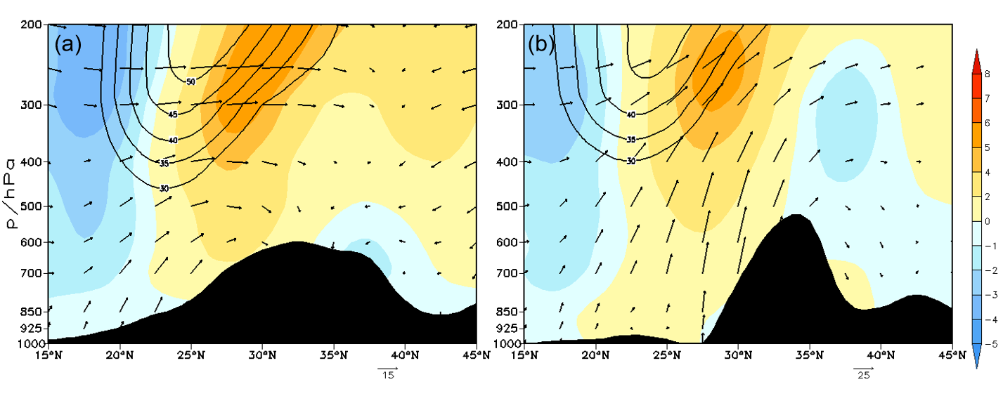 图2(原文图9) ESBT沿100°E(a)和WSBT沿80°E(b)的相对涡度(阴影:单位:10⁻⁵ 秒⁻¹)、垂直速度(×-1000)(矢量,单位:Pa/s)及西风急流(u≥30;等值线,单位:m/s)的经向-高度垂直合成剖面图 (黑色阴影表示地形)