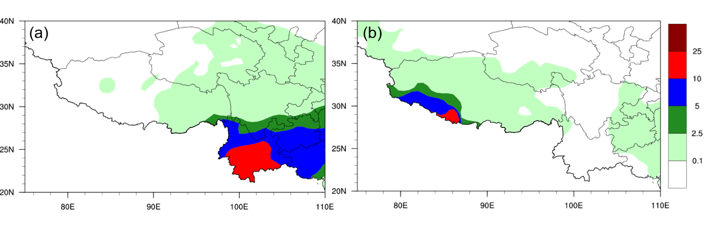 对10个典型SBT个例的合成分析显示:ESBT引发的降水主要分布于90°E以东的藏东南及云贵高原,范围广且强度大(图1a);WSBT的降水则集中在90°E以西的藏西南,范围更集中(图1b)。整体来看,ESBT案例中日均降水量超10 mm的区域显著大于WSBT。