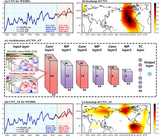 图2 卷积神经网络(CNN)的框架、预测及可解释性。(a)观测(黑线)、CNN拟合(蓝线)和独立预测(红线)的WEHDs序列。(b)CNN可解释性热力图。(c)CNN框架示意图,输入场为前期1-5月的海温、两米温度、海平面气压异常场以及5月减4月、5月减3月、4-5月平均减12-1月平均的海温、两米温度、海平面气压场。(d-e)同(a-b),但为改进后的CNN。