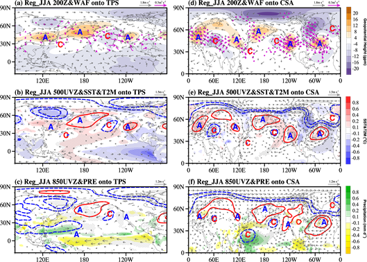 图1 前期因子影响WEHDs的物理过程。(a)200hPa高度场(阴影)和波活动通量(矢量),(b)500hPa高度场(等值线)、风场(矢量)和海表温度(阴影),(c)850hPa高度场(等值线)、风场(矢量)和降水场(阴影)回归至TPS。(d-f)同(a-c),但为回归至CSA。打点区域表示通过90%显著性检验。