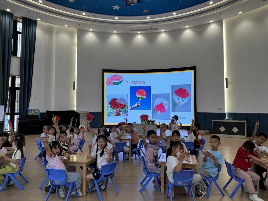 志愿者袁洹沐锦带领小朋友观察西瓜的形状、颜色、纹路,鼓励小朋友们充分发挥自己的想象力和创造力,用画笔和扇子制作出独一无二的西瓜扇,感受着手工制作带来的乐趣,同时也了解到夏至时节人们赠扇消暑的传统习俗。